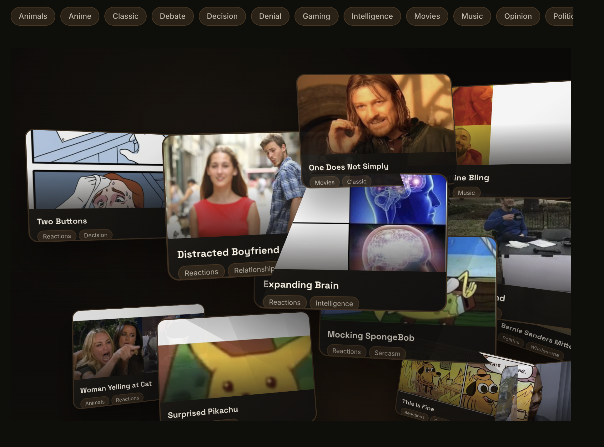 Search and discover memes for social media and group chats. Essential for Content Creators and Community Managers looking for quick visual reactions.