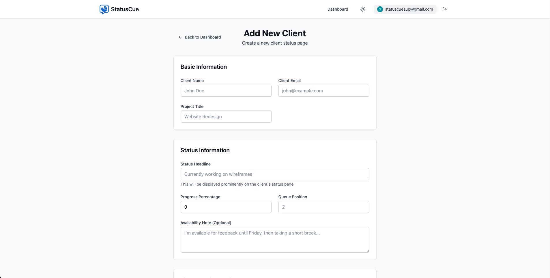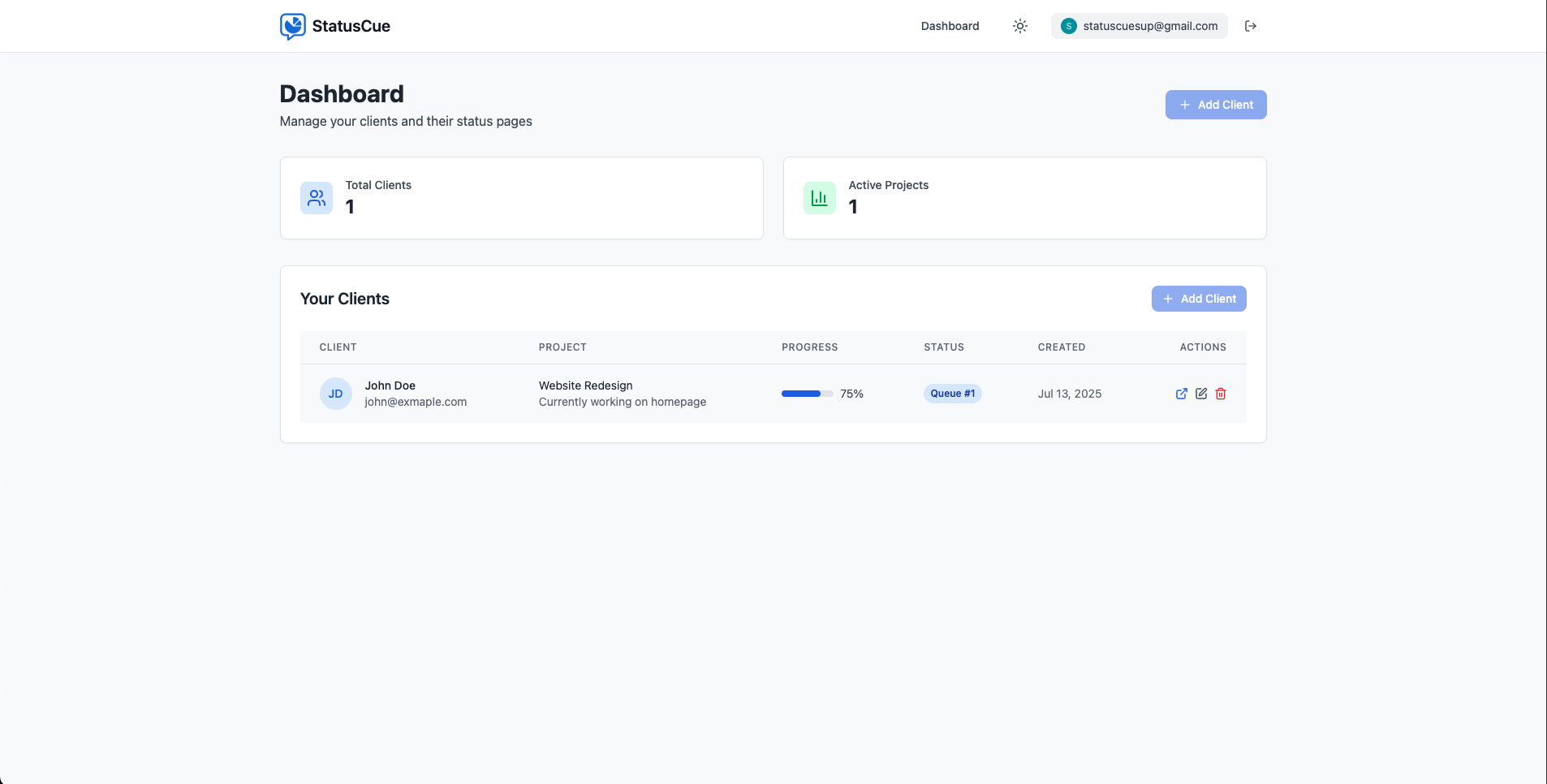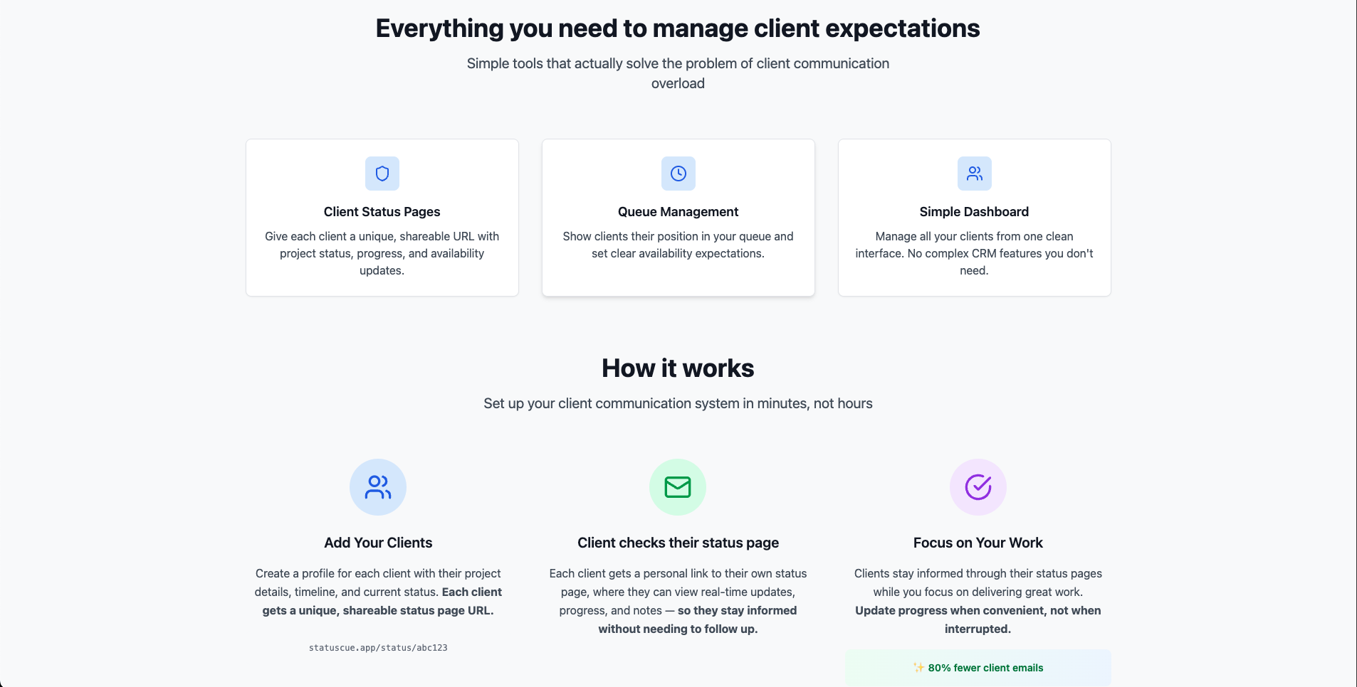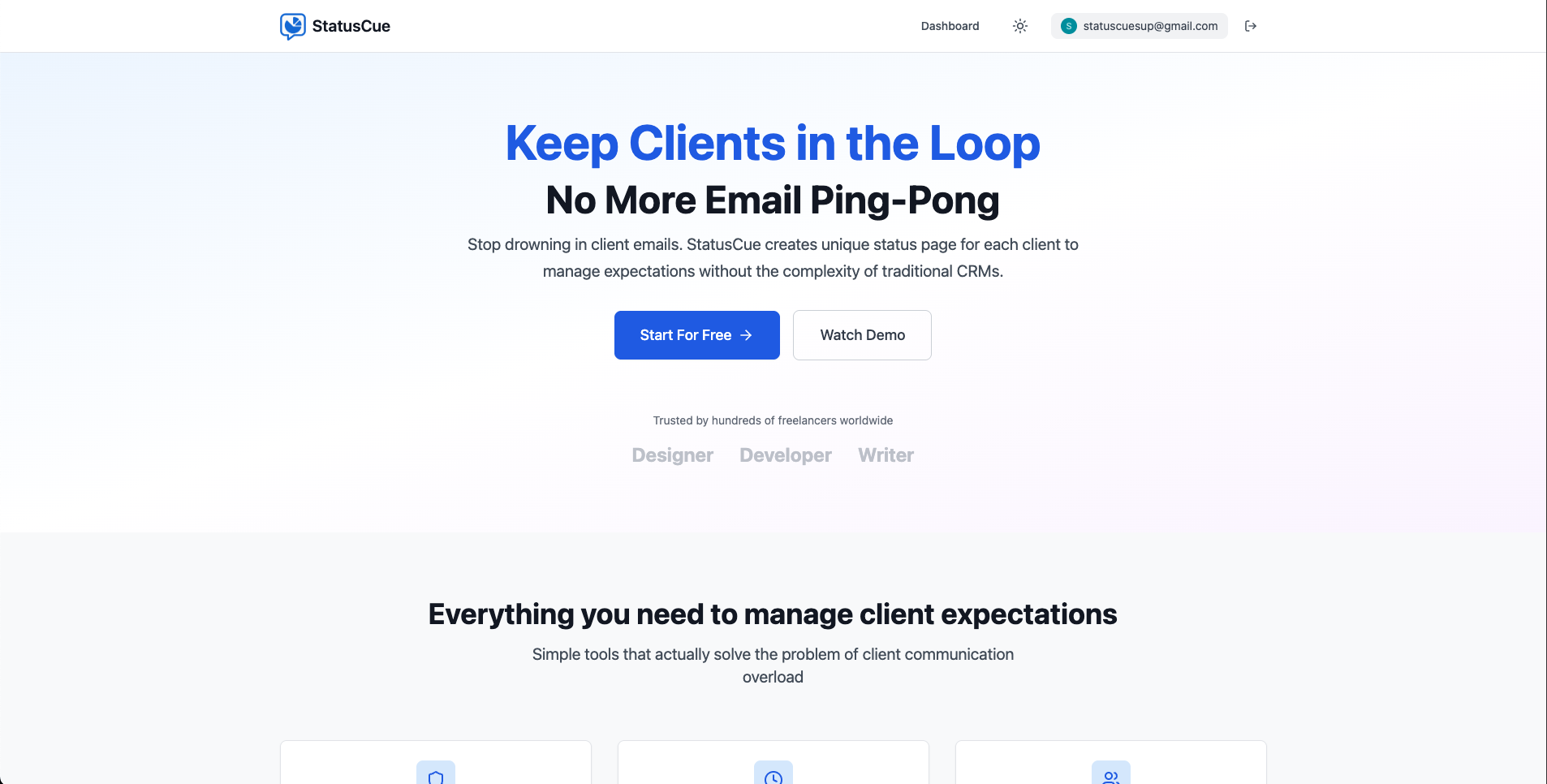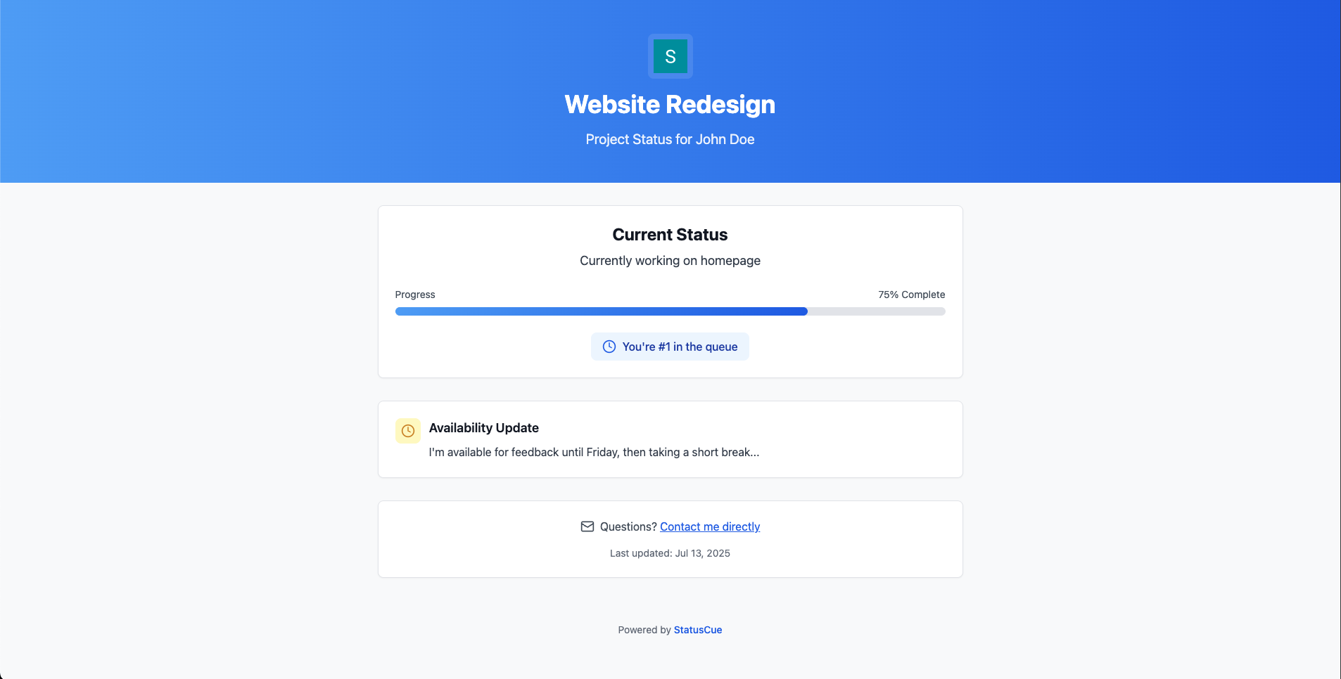 Stop drowning in client emails! StatusCue gives freelancers and solopreneurs a simple way to keep clients updated — without endless email threads or the overhead of complex CRMs. With just a few clicks, you can create a personalized status page for each client, showing real-time updates, project progress, and availability notes. Whenever you post a new update, StatusCue automatically notifies your client via email — no login required, no back-and-forth. It’s perfect for freelancers who want to manage multiple clients smoothly, set clear expectations, and stay focused on work instead of their inbox. Whether you’re juggling design gigs, web development projects, or consulting clients, StatusCue helps you build trust and reduce communication noise. No complex dashboards. No steep learning curve. Just a clean, professional way to stay in sync with your clients — and free for your first client.