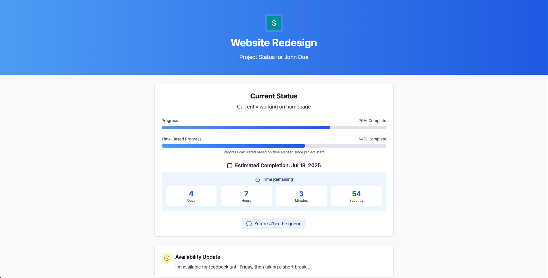 Reduce email noise with personalized project status pages for clients. Ideal for freelancers and solopreneurs. Get started for free with your first client.