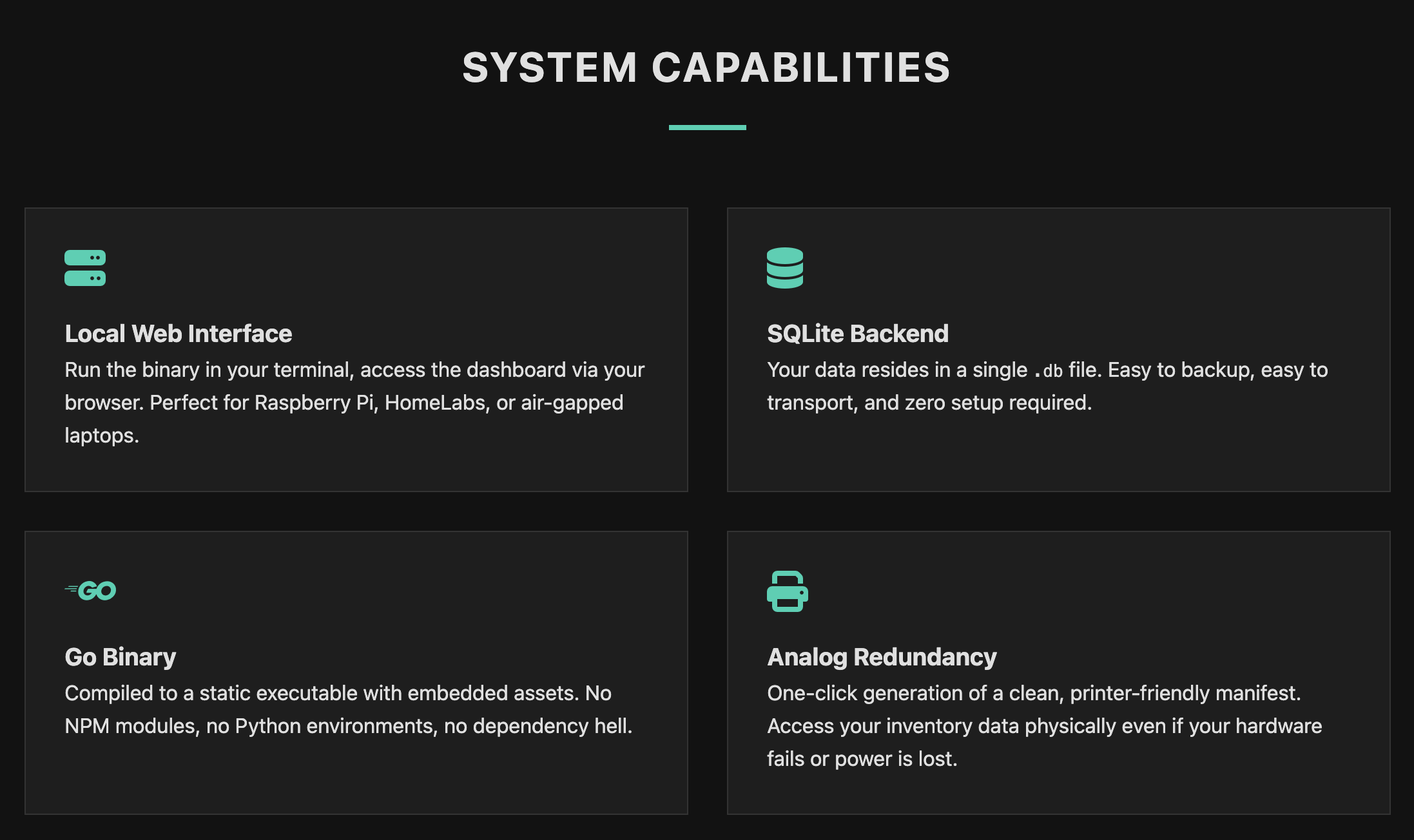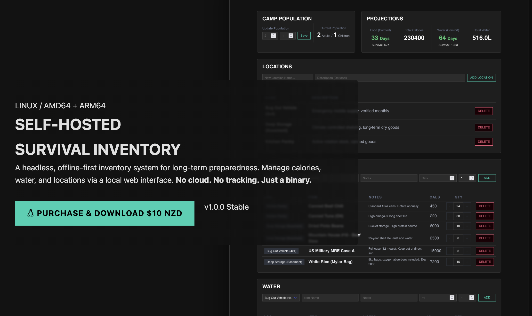 A headless, offline-first inventory system for long-term preparedness. Manage calories, water, and locations via a local web interface. No cloud. No tracking. Just a binary. Pay once and own it forever. Currently only officially supported binaries for Linux x64 and Linux ARM64, but I have some binaries for Windows and MacOs under development and would be happy to sell them for a discounted price.