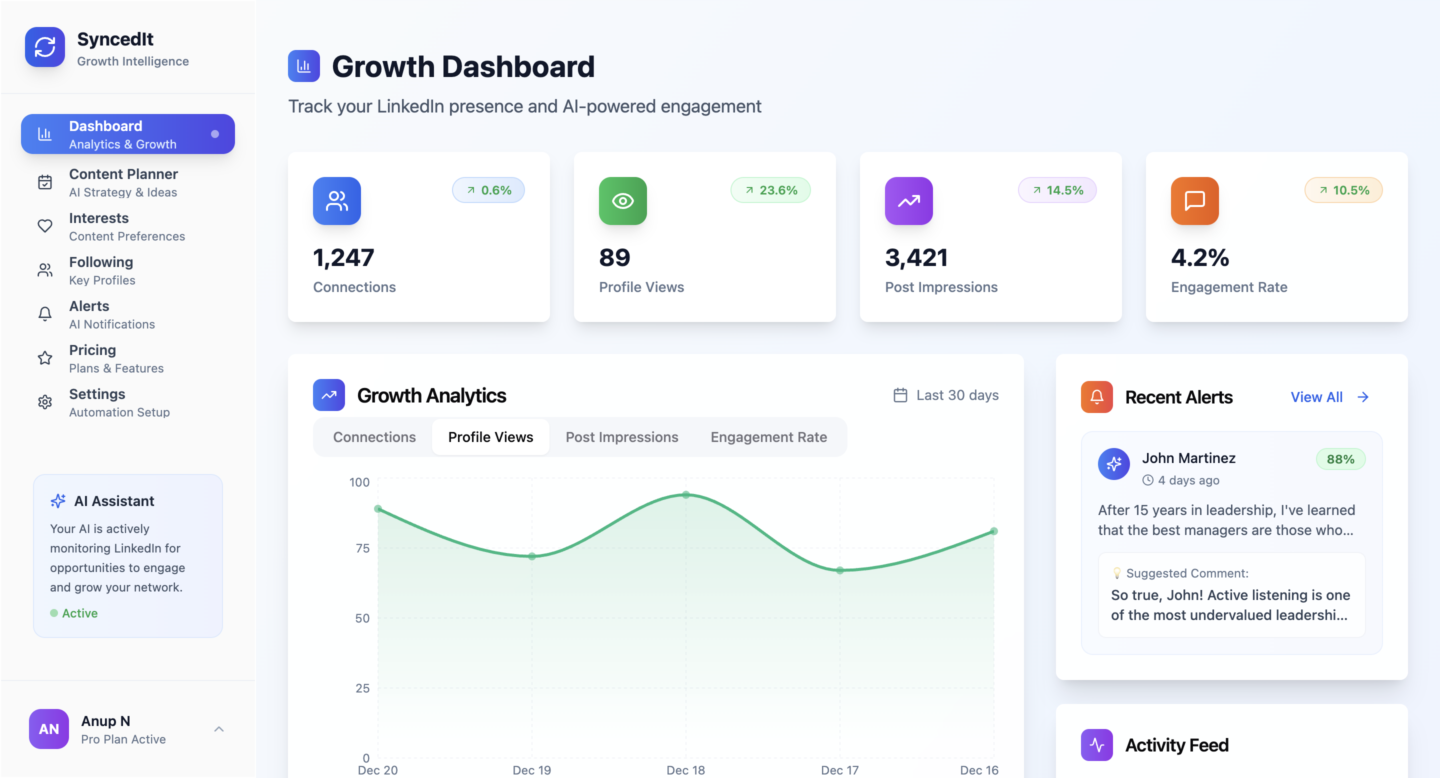 Syncedit is an AI-powered LinkedIn productivity tool built for founders, creators, and B2B professionals who want to post smarter, engage with the right profiles, and filter out trash content from their feed. With Syncedit, you can: 1. Track high-value LinkedIn profiles and get alerts when they post 2. Instantly generate post ideas tailored to your niche 3. Save and schedule content inside a built-in calendar 4. Bookmark only the most relevant profiles to improve your feed quality 5. Get smart daily engagement prompts to build your personal brand 6. Whether you’re a founder, marketer, or ghostwriter, Syncedit helps you show up consistently and strategically on LinkedIn, without the overwhelm.