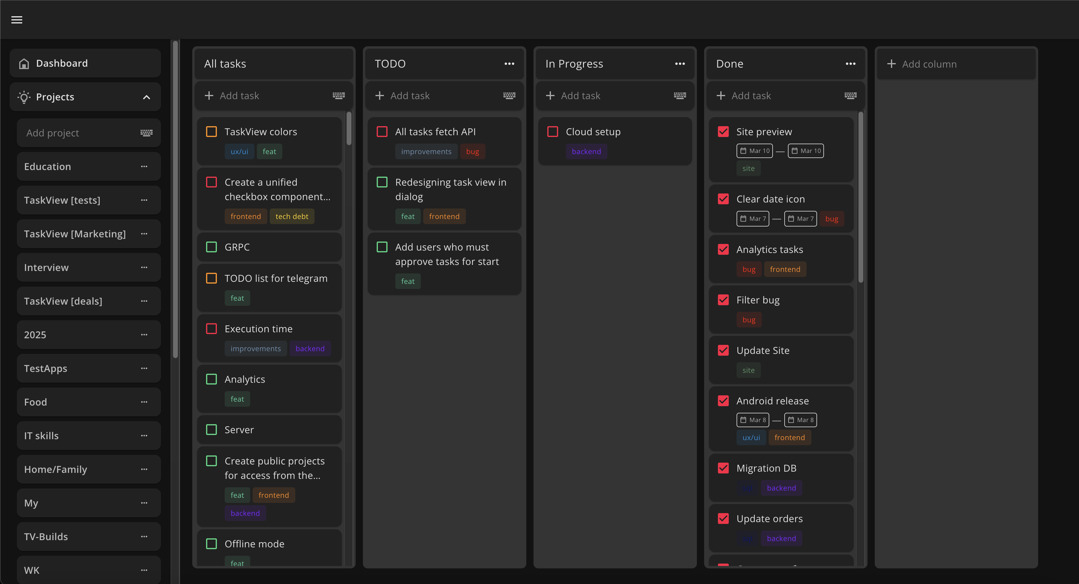 TaskView is a self-hosted modern project and task management system designed for teams and individuals who want full control over their data. Unlike typical SaaS tools, TaskView can be self-hosted via Docker in just a few minutes, so all your projects, tasks, and analytics stay on your own servers. Key features: Projects → Lists → Tasks hierarchy Tags, priorities, and deadlines for flexible organization Kanban boards for visual workflow management Collaboration with role-based access control Productivity analytics (charts & insights on completed tasks) Mobile and desktop apps for seamless access Privacy first: No ads, no tracking, no analytics in the clients or the server API. All data stays with you.