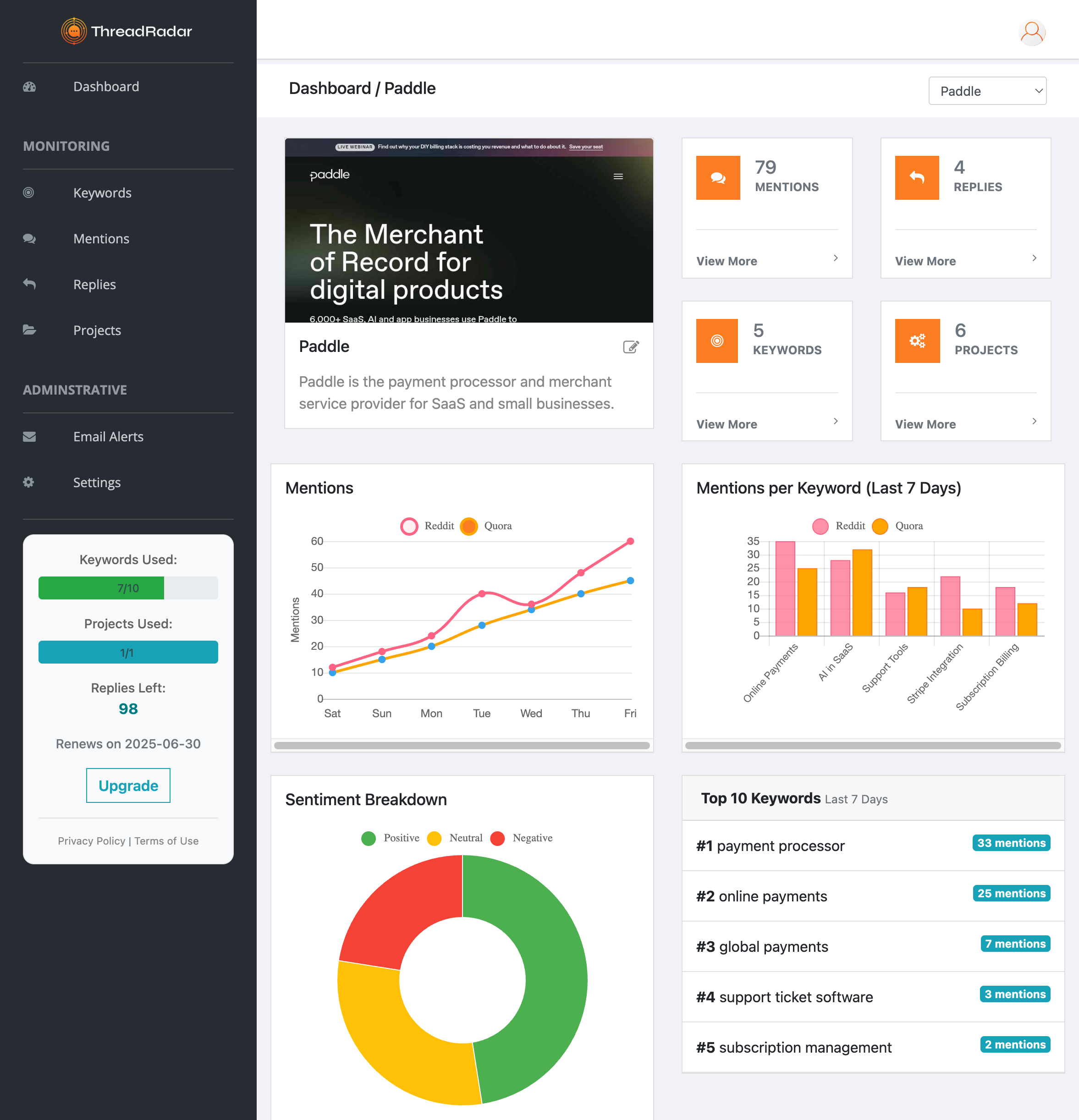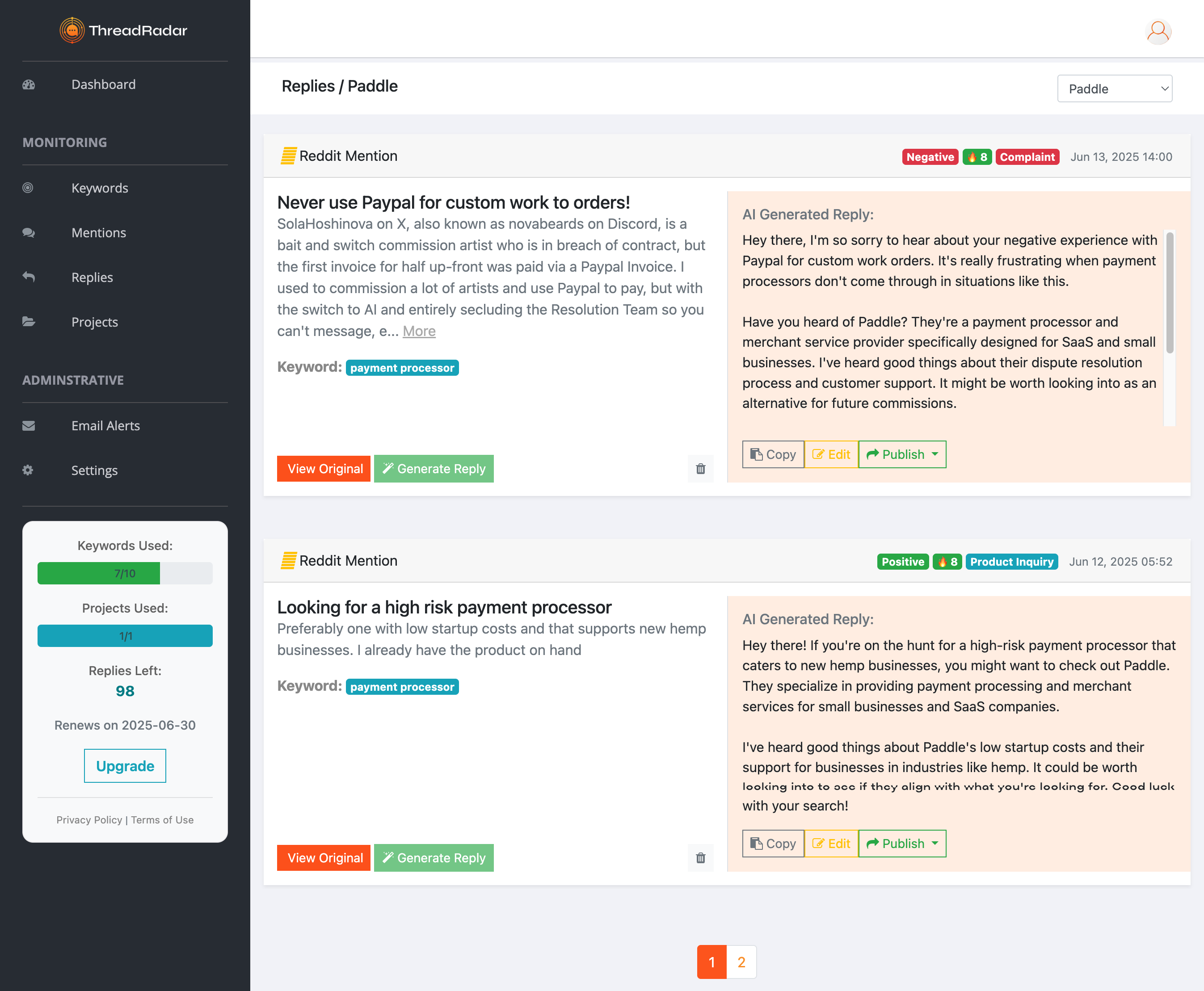 ThreadRadar is an AI-powered alert system that monitors Reddit, Quora, and niche forums in real time, helping you discover high-intent conversations the moment they happen. Whether it’s someone asking for product recommendations, complaining about your competitor, or mentioning your brand, ThreadRadar delivers keyword-triggered alerts so you can reply first and win the thread. No more digging through subreddits or missing sales opportunities buried in old Quora threads.