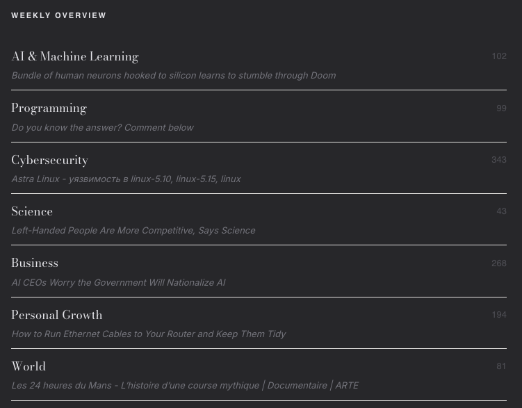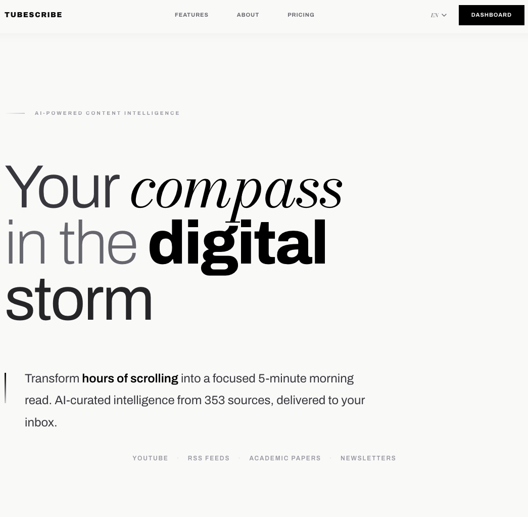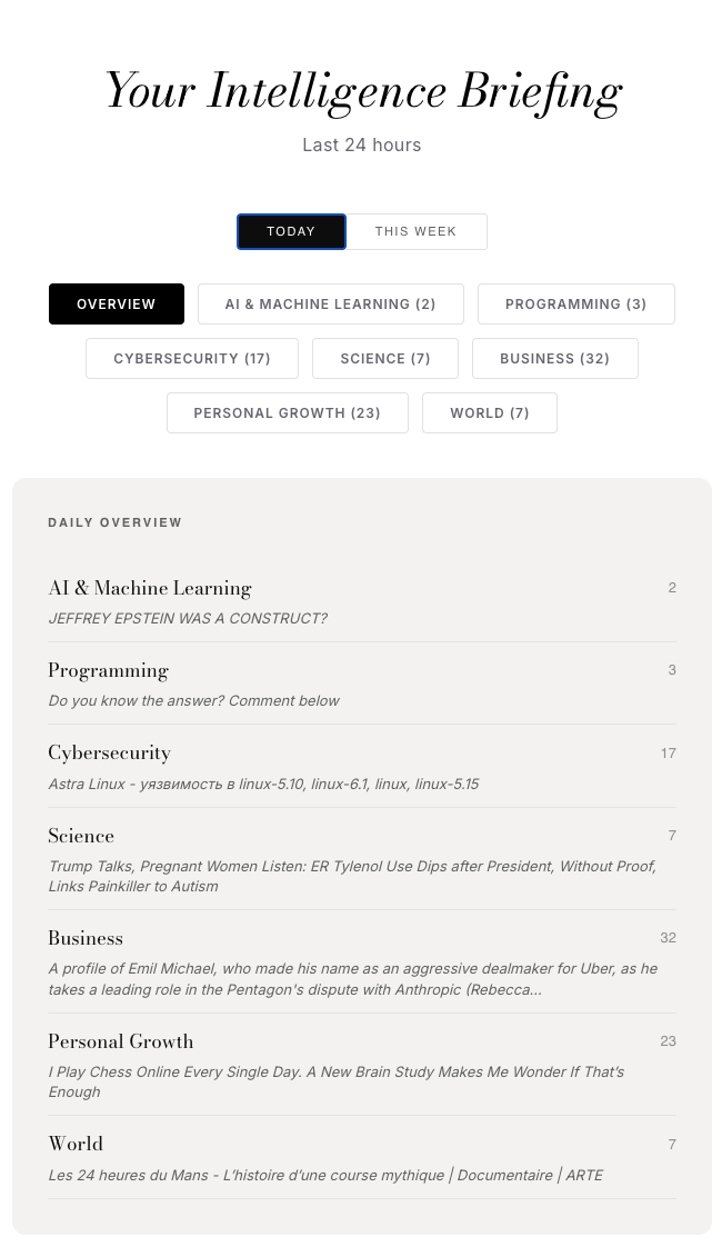 TubeScribe monitors 353 sources every night across 7 themes: AI & Machine Learning, Programming, Cybersecurity, Science, Business, Growth, and World Affairs. It transcribes YouTube videos in full using Whisper, reads RSS feeds, newsletters and academic papers, summarises everything with a local AI model, and delivers a clean editorial digest to your inbox at 9 AM. Available in English, French, German and Spanish. No ads, no sponsored content, no algorithmic noise.