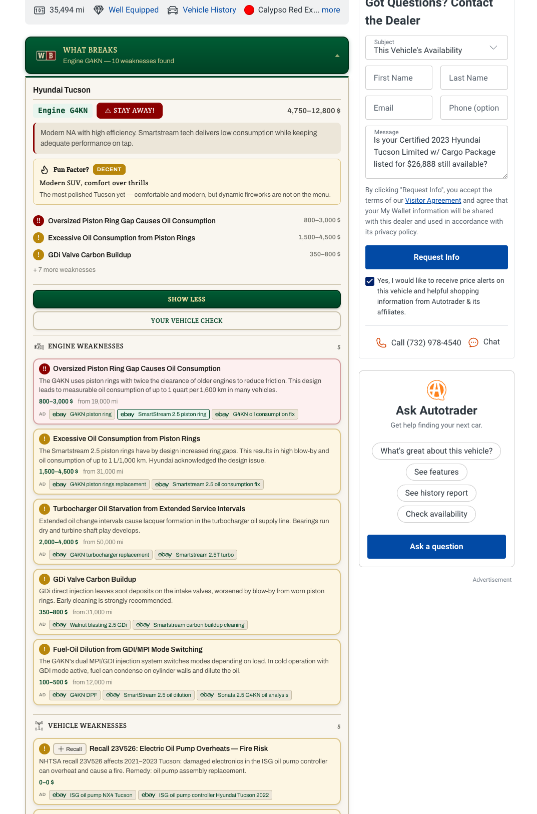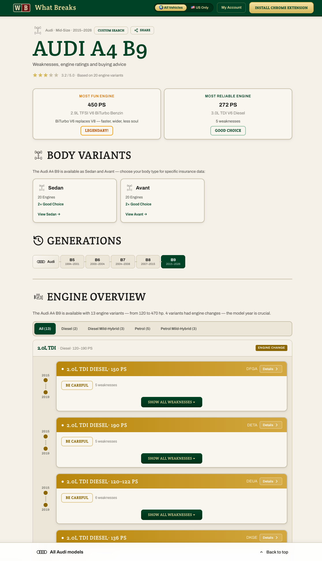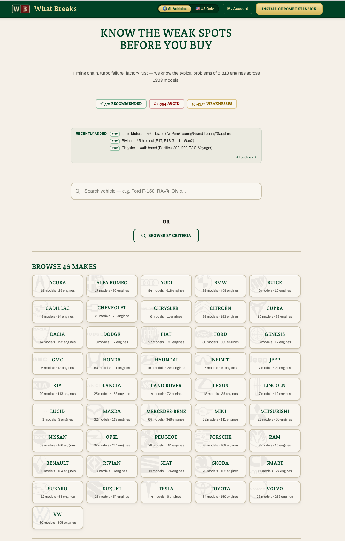 Access the largest used car weakness database for free. Get engine-specific reliability ratings and repair costs. Ideal for non-technical car buyers.