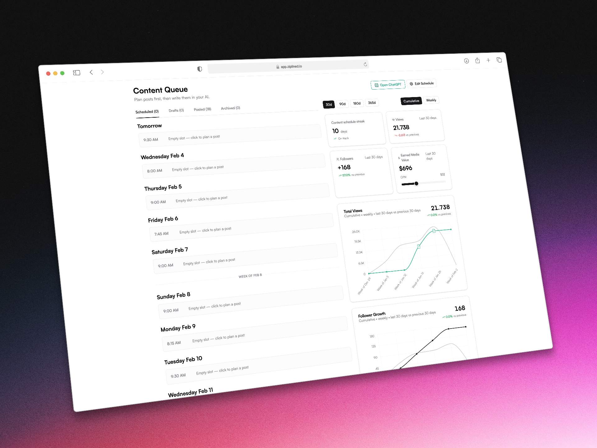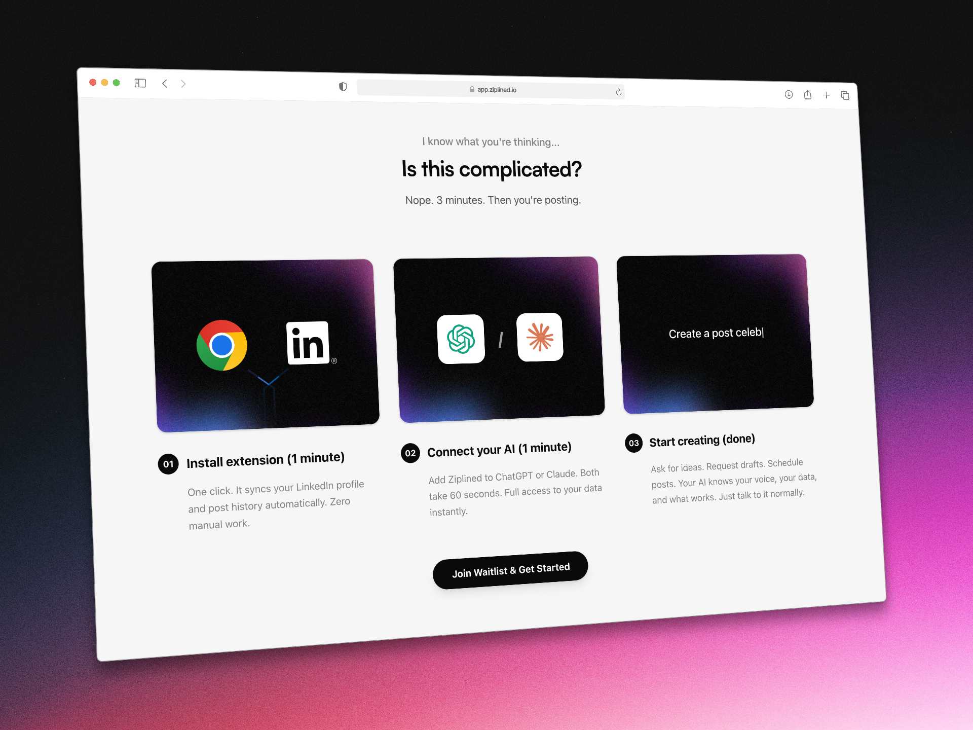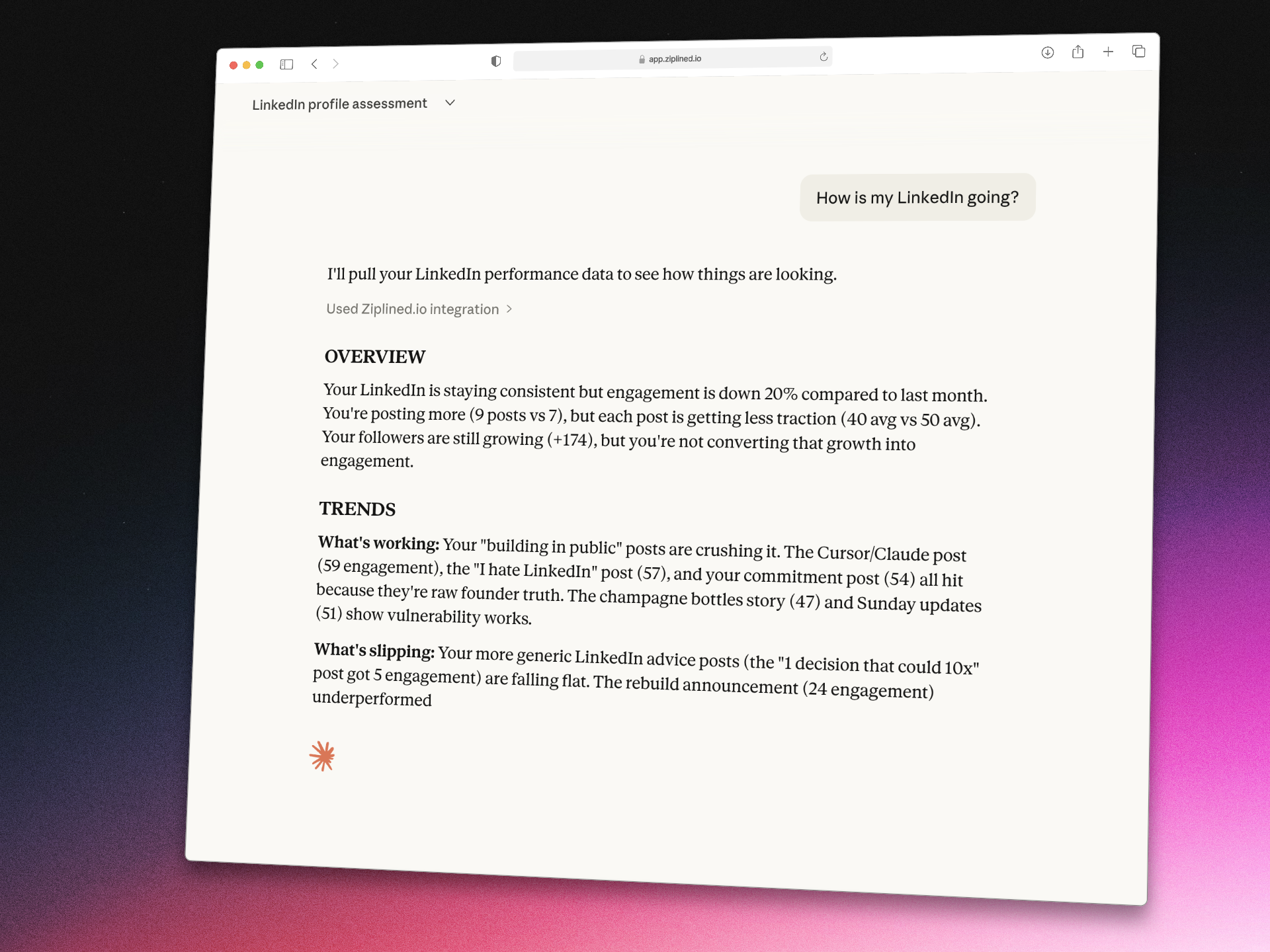 AI-generated LinkedIn content is terrible. It's generic, cringe, and obvious. But you can't spend 2 hours per post when you have 38 other things on your todo list. Ziplined upgrades ChatGPT/Claude into a LinkedIn expert trained on YOUR voice, YOUR performance data, and 10,000+ posts that got founders actual clients. What you get: - Weekly digests of YOUR performance (what's working, what's dying) - Voice training from your posts + docs (sounds like you, your insights/stories) - 10,000+ proven post formats (real results, not guru templates) - Smart scheduling (finds your next slot, reminds you to publish) - Plain-English insights from your actual data Results: 355 founders in alpha went from 2 hours per post to 5 minutes while actually enjoying it. $19/mo for founding members (locked in forever). Free waitlist until Feb 9th launch. Stop posting AI slop. Start sounding like yourself.